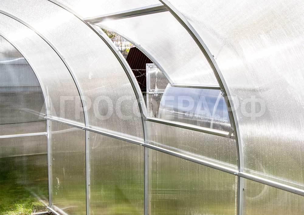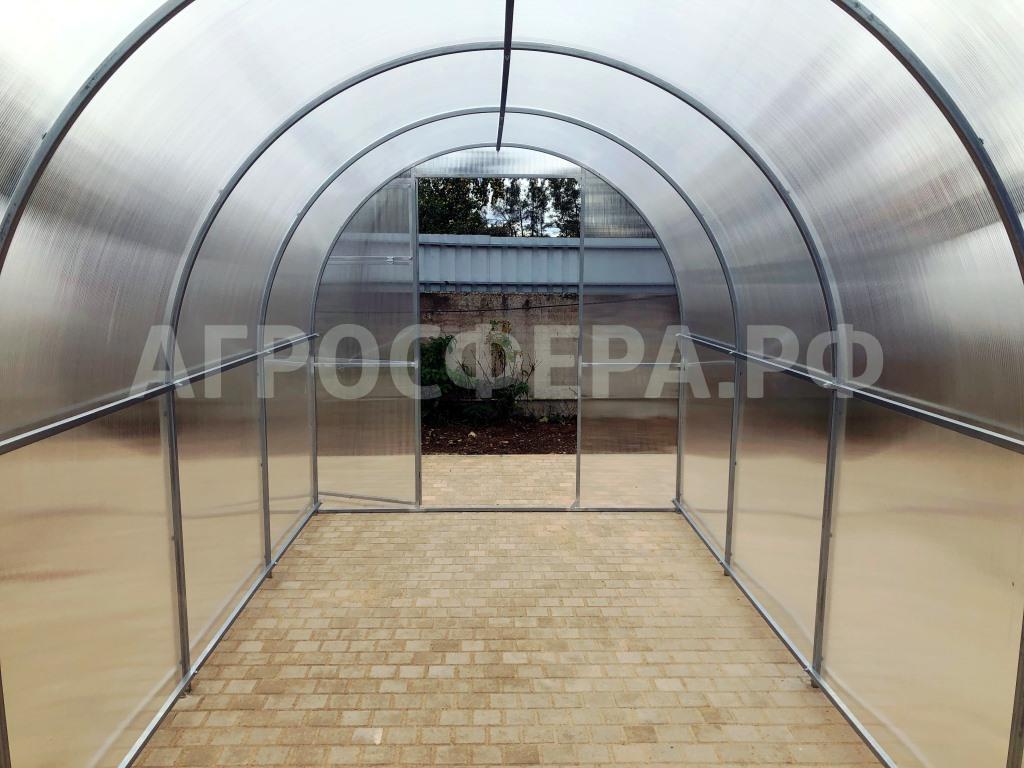 Усиленную теплицу Агросфера-Плюс выбирают те, кто ищет повышенную надёжность. Практичная и эстетичная Агросфера-Плюс имеет больше дуг, чем базовая модель Агросфера-Стандарт. Преимущества такой конструкции — особая прочность каркаса и более равномерное распределение снеговой нагрузки на сотовый поликарбонат.
