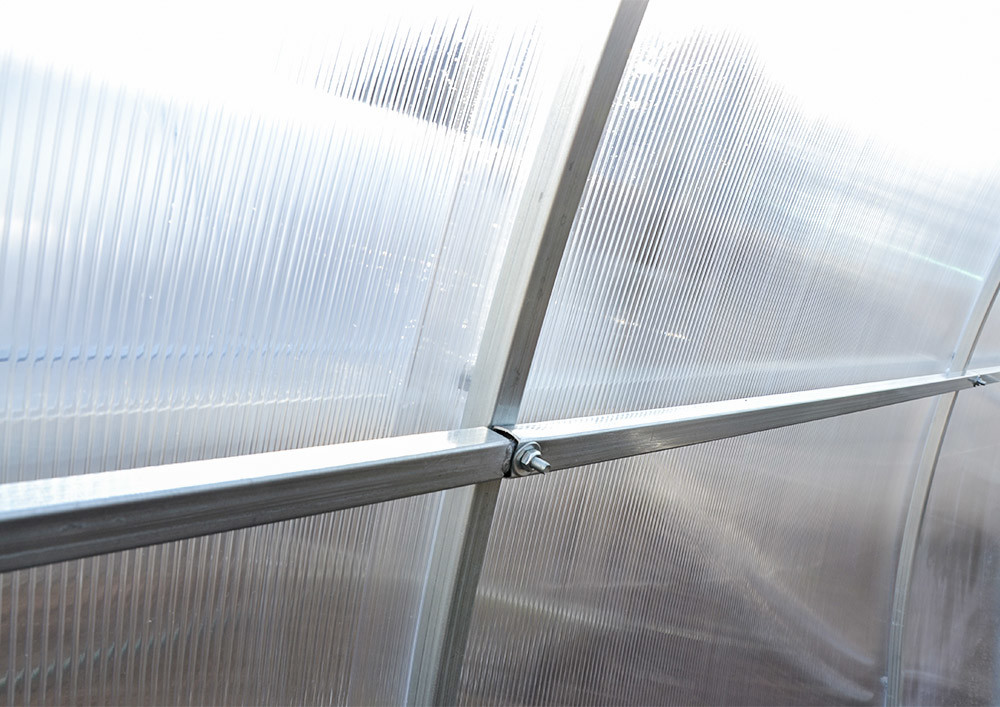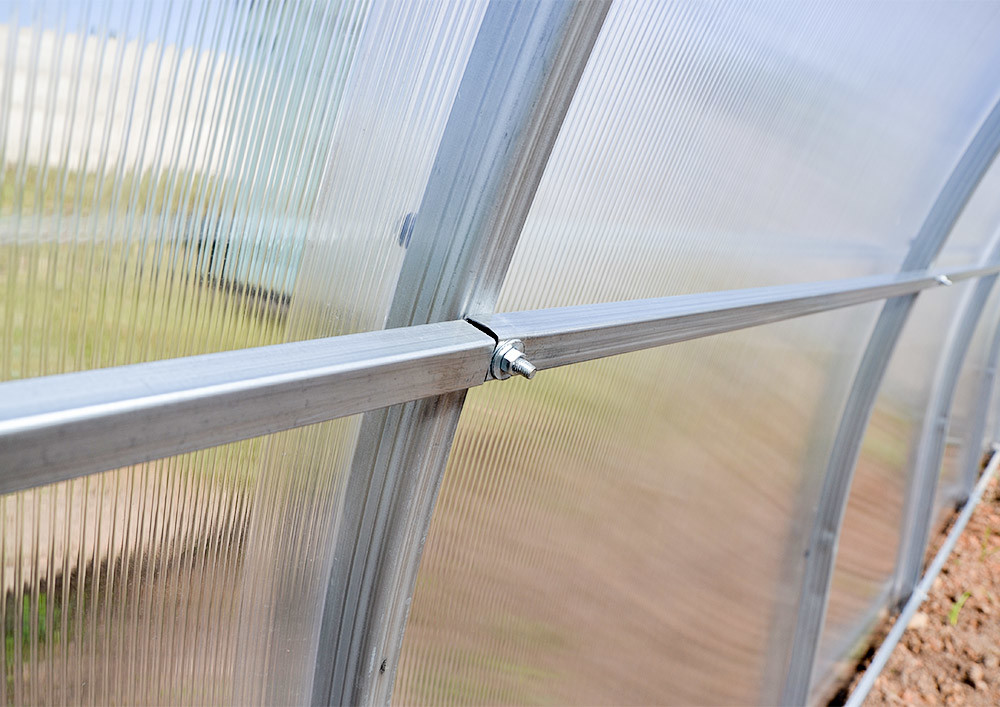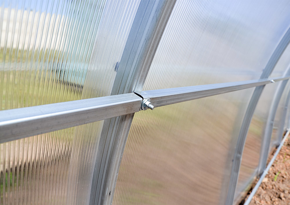 Дуги — главный несущий элемент теплицы. Для модели Агросфера-Простор изготавливаются специальные двойные дуги из стальной трубы 40х20 мм, соединенных между собой прогонами из оцинкованной трубы 40х20 мм. Прогоны фиксируются с помощью крабовых соединений, что обеспечивает соединение в одной плоскости с дугами, давая дополнительную опору для сотового поликарбоната и придавая жесткость каркасу.