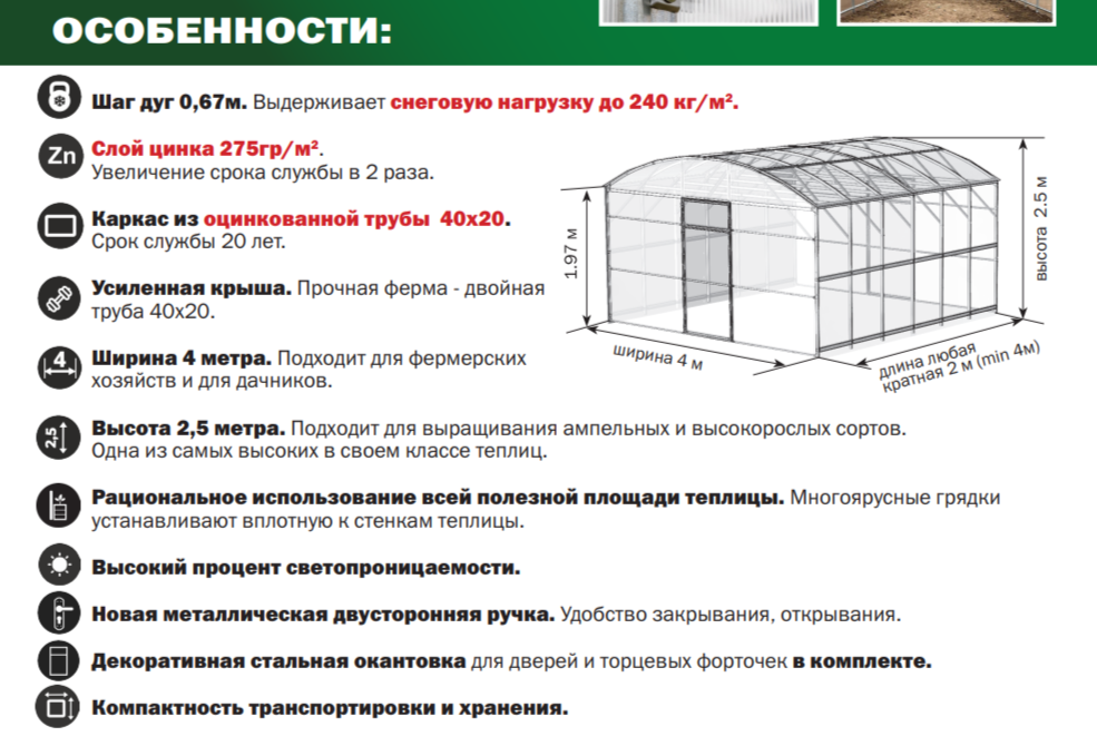 Особенности - благодаря каркасу из оцинкованной профильной трубы производства холдинга Северсталь, теплица не подвержена ржавчине и не требует подкраски во время эксплуатации. Усиленные дуги в виде фермы 40х20 + 20х20 и увеличенное количество перемычек (стяжек) - 9 шт. + 2 усиленных конька (уголка) = ИТОГО 11 шт. в плоскости с дугами позволяет выдерживать любые снеговые нагрузки.