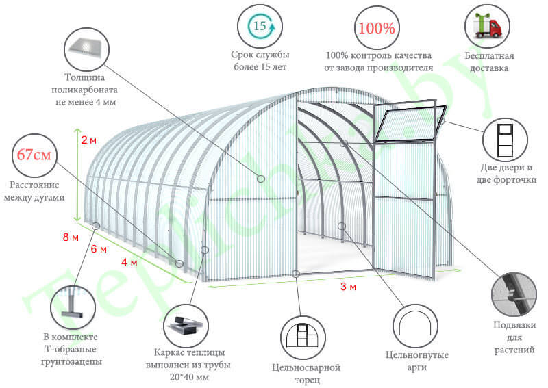 Длина теплицы: от 4 м до любой длины; шаг удлинения — по 2 мШаг дуги: 0,67 м