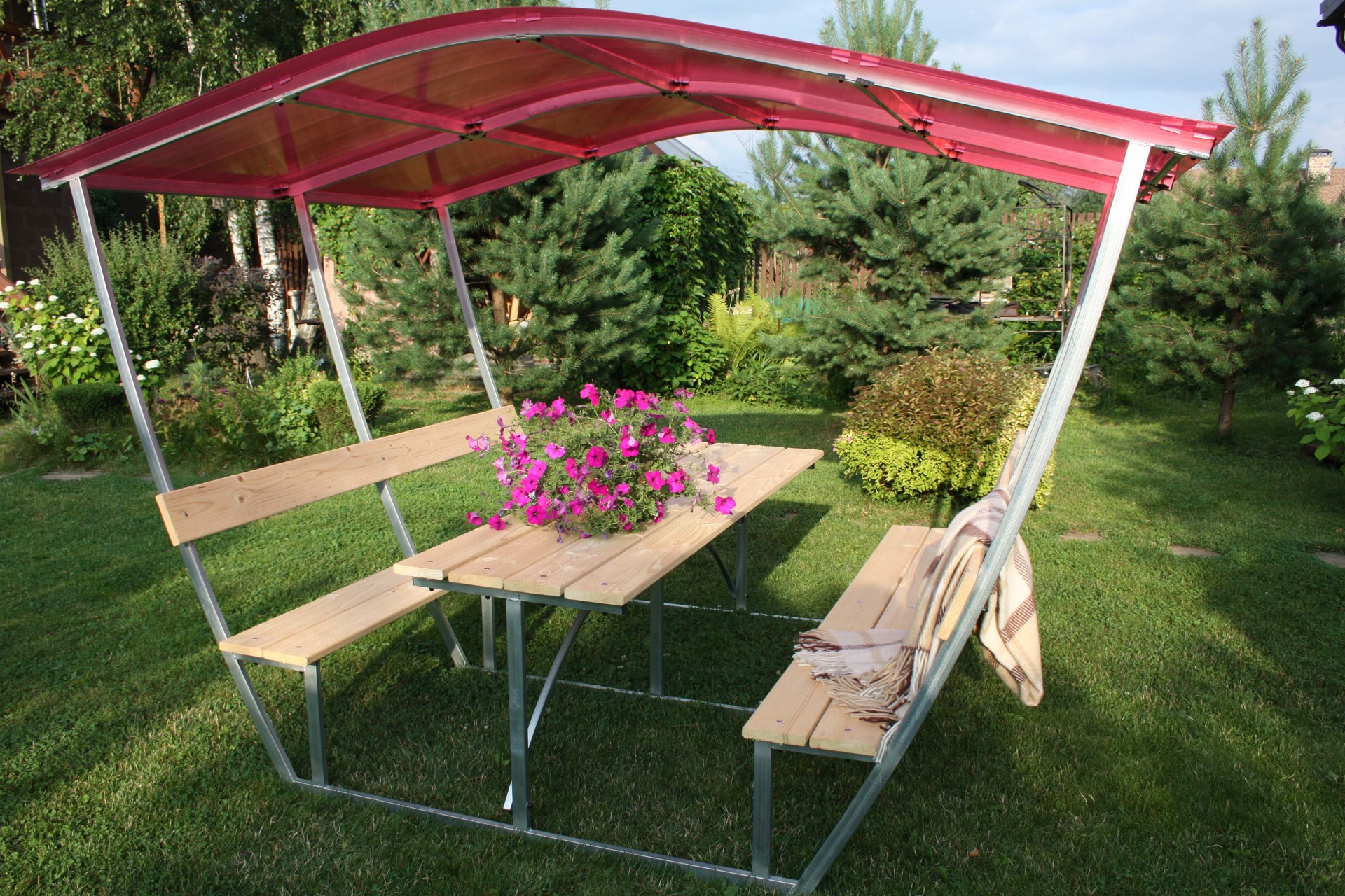 Заказали через интернет, доставка быстрая, привезли прямо на дачу. Собирали вдвоем с мужем по инструкции и с привлечением интернета. Есть несколько роликов с показательными уроками. Все металлические детали с цинковым покрытием. В нужных местах уже высверлены отверстия. Сам каркас собрали очень быстро.